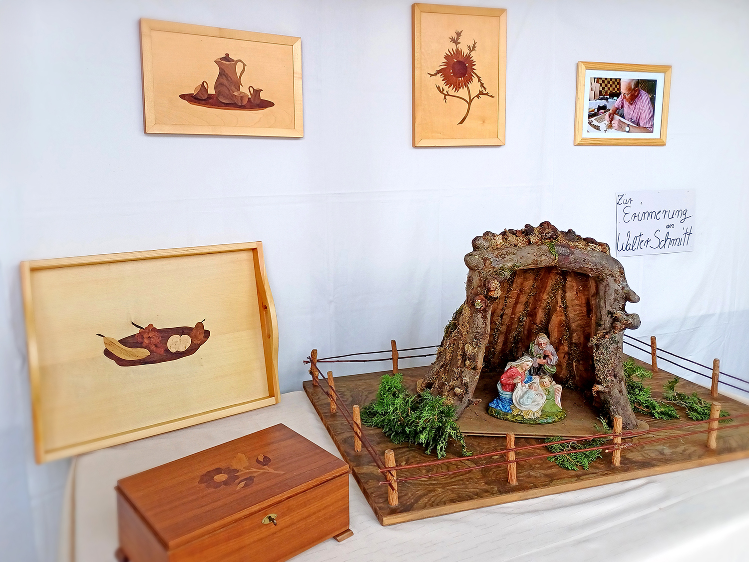 Eine Auswahl von Arbeiten des im Jahr 2025 verstorbenen Kleinsassener Intarsienkünstlers und Kunsthandwerkers Walter Schmitt präsentiert der Verein Malerdorf Kleinsassen e.V. bis November 2025 in seinem Vereinsraum „Kunst im kleinen Rahmen“ im DGH Kleinsassen.